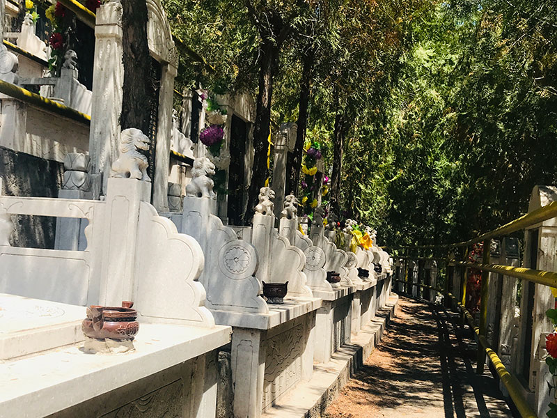 西山公墓内遍植苍松翠柏,还有茂密的灌木花丛,建筑则以灰砖青瓦的仿古式建筑为主。古典质朴的屋舍掩映在白石栏杆、鹅卵石墙和郁郁葱葱的绿树繁花之中,一座座做工精美的墓碑错落有致的坐落在其中,既不失庄严肃穆,又多了一份温馨宁静。